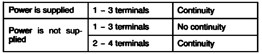 Apply battery voltage to terminal 2, and check the continuity between the terminals when terminal 4 is earthed.