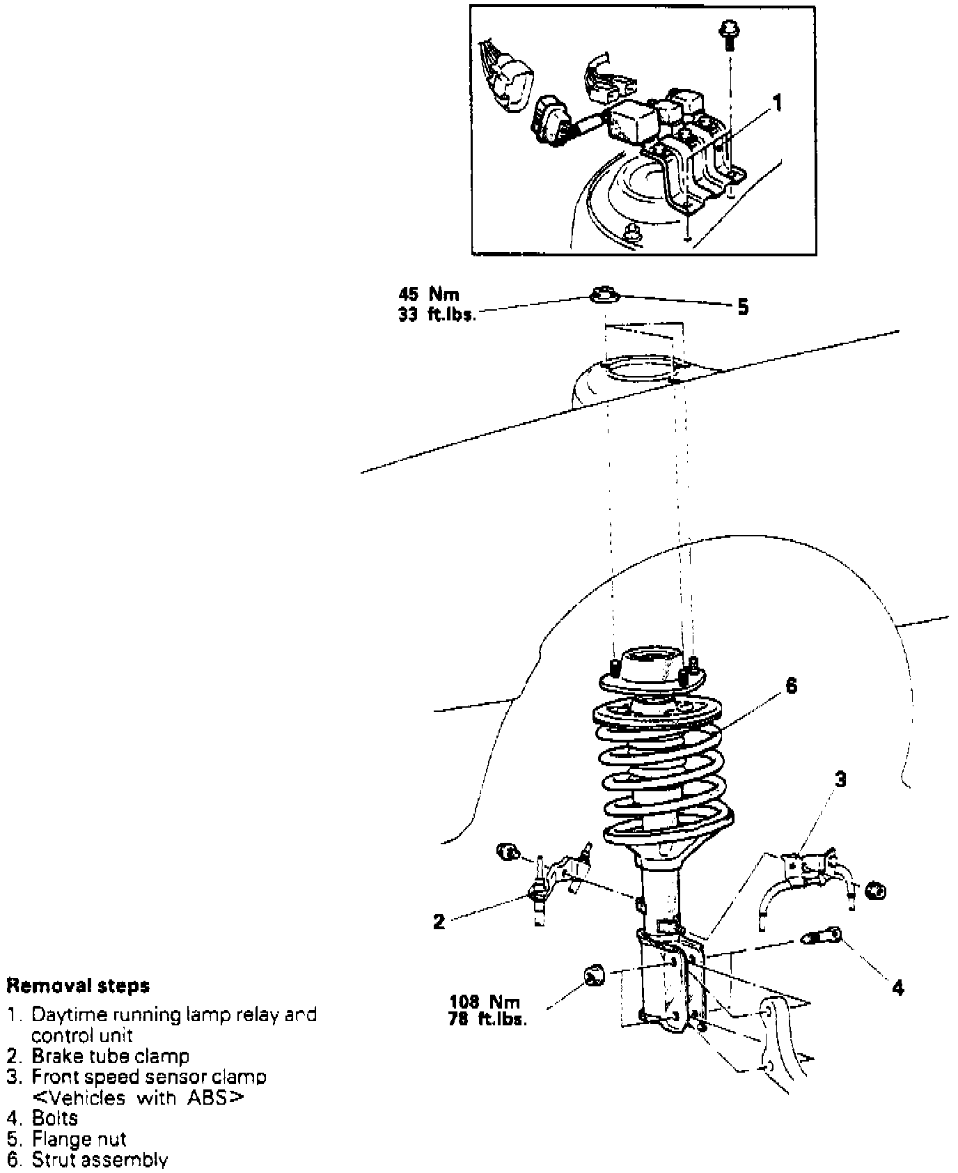 2. On all models, remove strut assembly as shown. Suspend lower arm from vehicle with suitable wire.