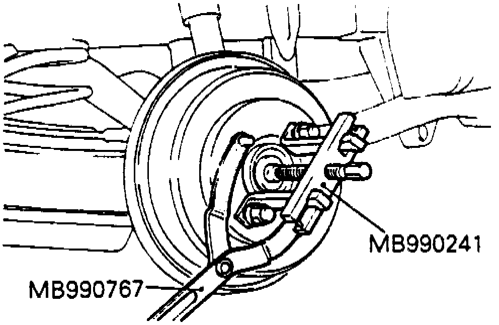 5. Remove companion flange to differential carrier bolts. Support driveshaft and press driveshaft out of rear axle hub using rear axle puller and spanner wrench tool No. MB990241 and MB990767, or equivalents.