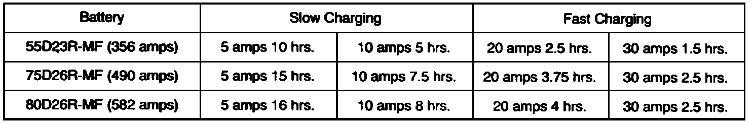 NOTE: When the charging is performed at 5 Amps, charging is virtually 100 % three hours after the indicator's indication changes from white to green. Use fast charging only in an emergency. If the indicator does not turn to green even after the battery is charged, the battery should be replaced; do not overcharge.