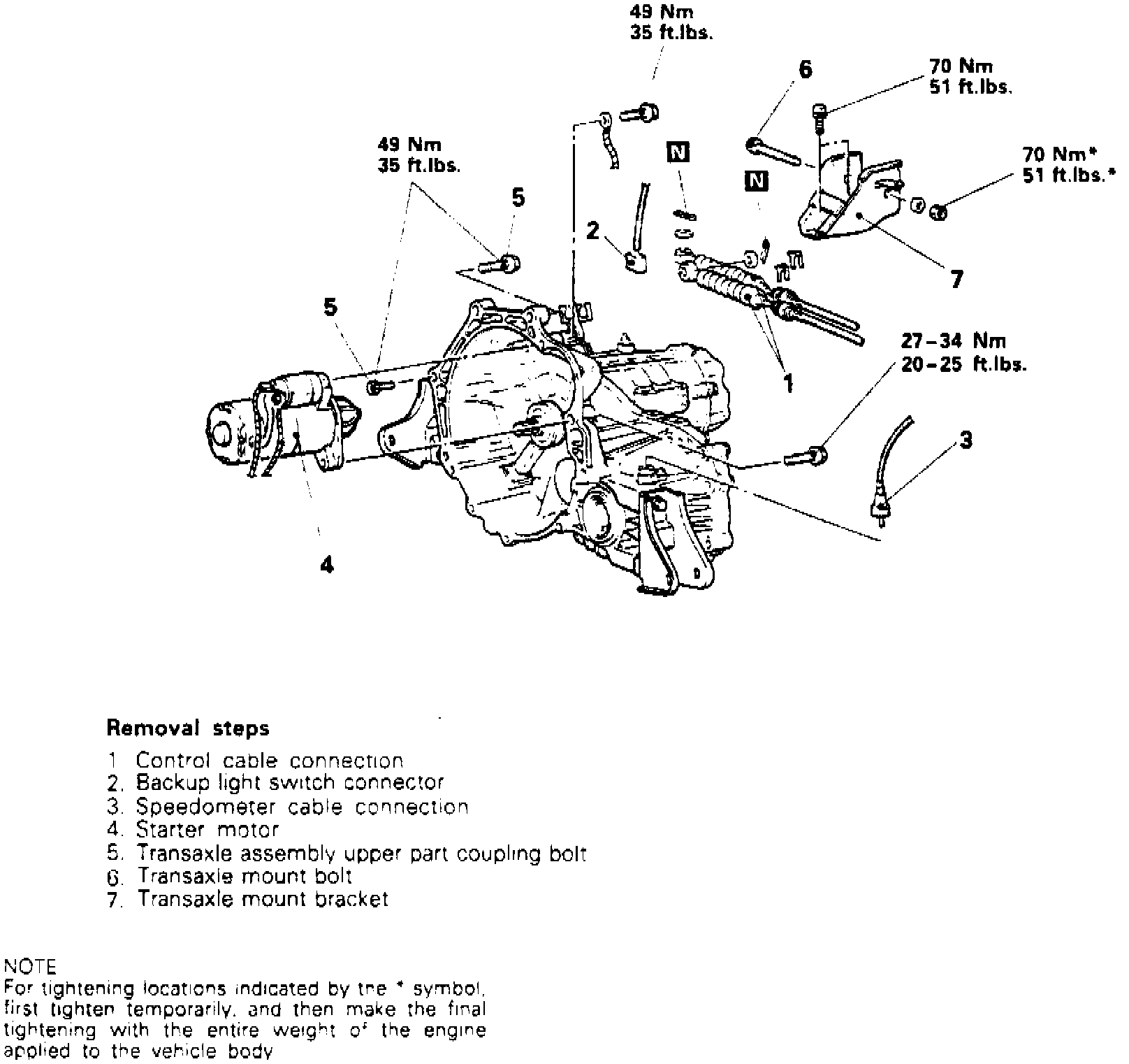 3. Remove transaxle in numbered sequence shown, noting following: