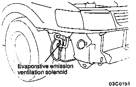 The Evaporative Emissions Ventilation Solenoid is located on the right side of the vehicle, just forward of the tire.