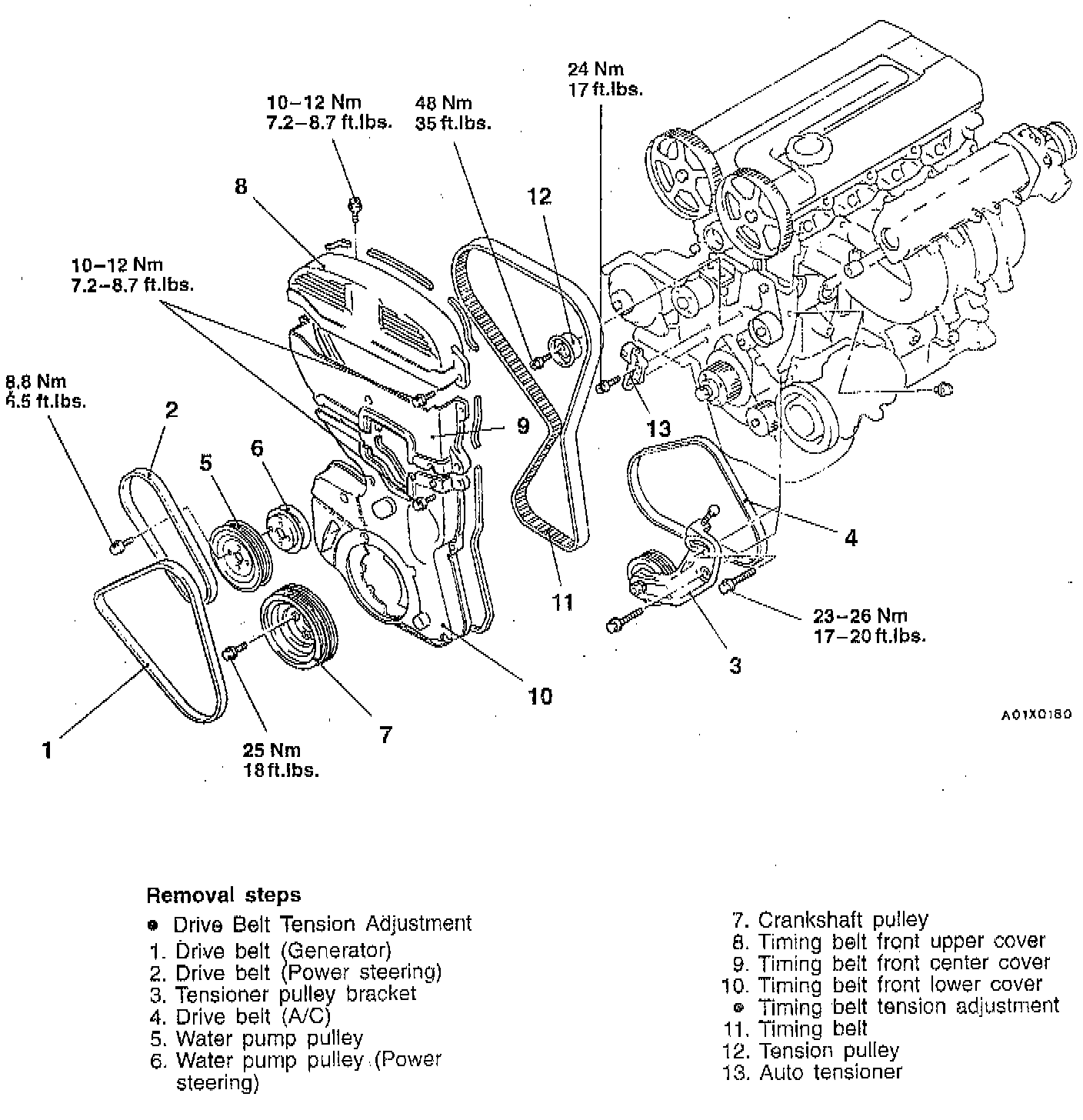 7. Move the tension pulley to the water pump side, and then remove the timing belt.