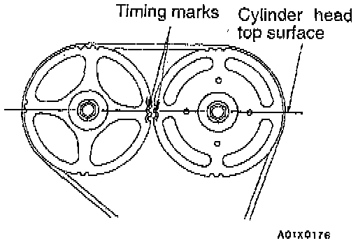 b. Install the timing belt around the exhaust side sprocket, aligning the timing marks with the cylinder head top surface using two wrenches.