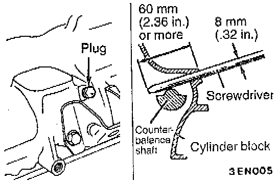 8. After aligning the timing mark on the oil pump sprocket, remove the cylinder block plug and insert a Phillips screwdriver with a diameter of 8 mm (0.32 inch), and check to be sure that the screwdriver goes in 60 mm (2.36 inch) or more. If the screwdriver will only go in 20 - 25 mm (0.79 - 0.98 inch) before striking the counterbalance shaft, turn the sprocket once, realign the timing mark and check that the screwdriver goes in 60 mm (2.36 inch) or more. Do not take out the screwdriver until the timing belt is installed.