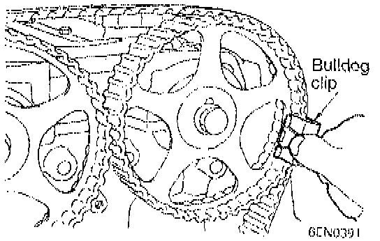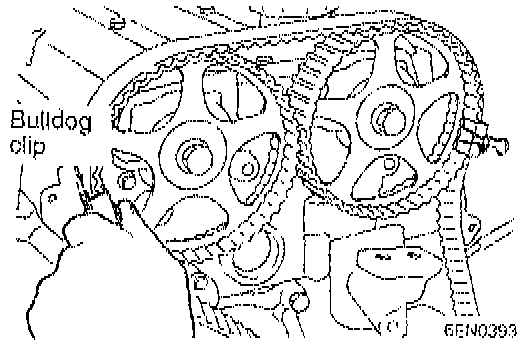 a. Install the timing belt around the intake side camshaft sprocket and fix it at indicated position by a bulldog clip.