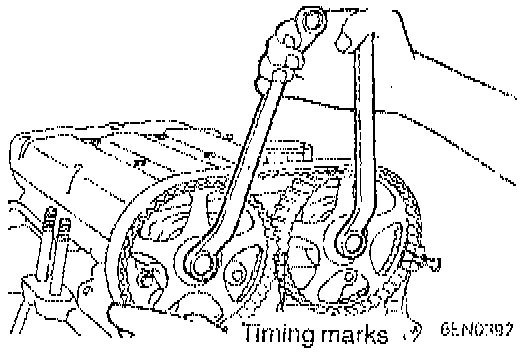 14. After turning the crankshaft 1/4 of a revolution in the counterclockwise direction, turn it in the clockwise direction until the timing marks are aligned.