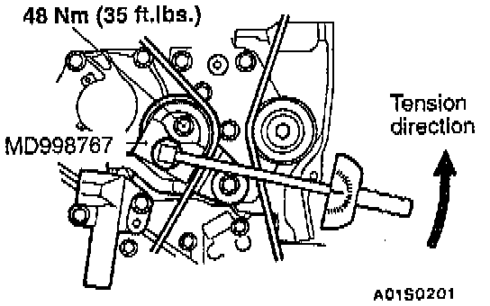 15. Loosen the tension pulley fixing bolt, and then use the special tool and a torque wrench to tighten the fixing bolt to 3.5 Nm (2.6 ft. lbs.) while applying tension to the timing belt.