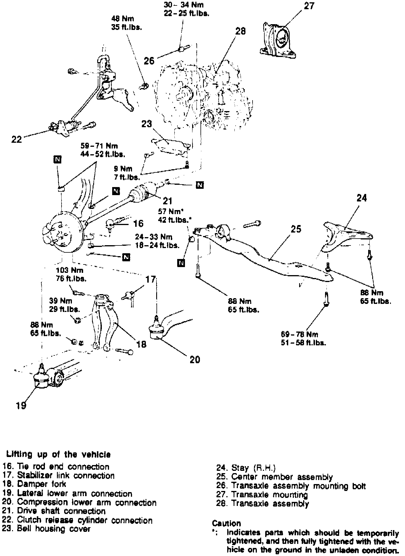5. Using a suitable jack, slightly raise transaxle, then remove mounting bracket nuts. Do not tilt transaxle assembly.