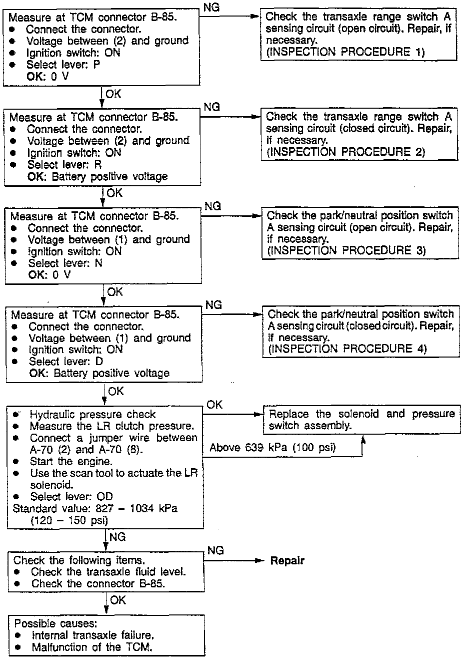 - Harness or connector between transaxle range switch and TCM open or short-circuited
