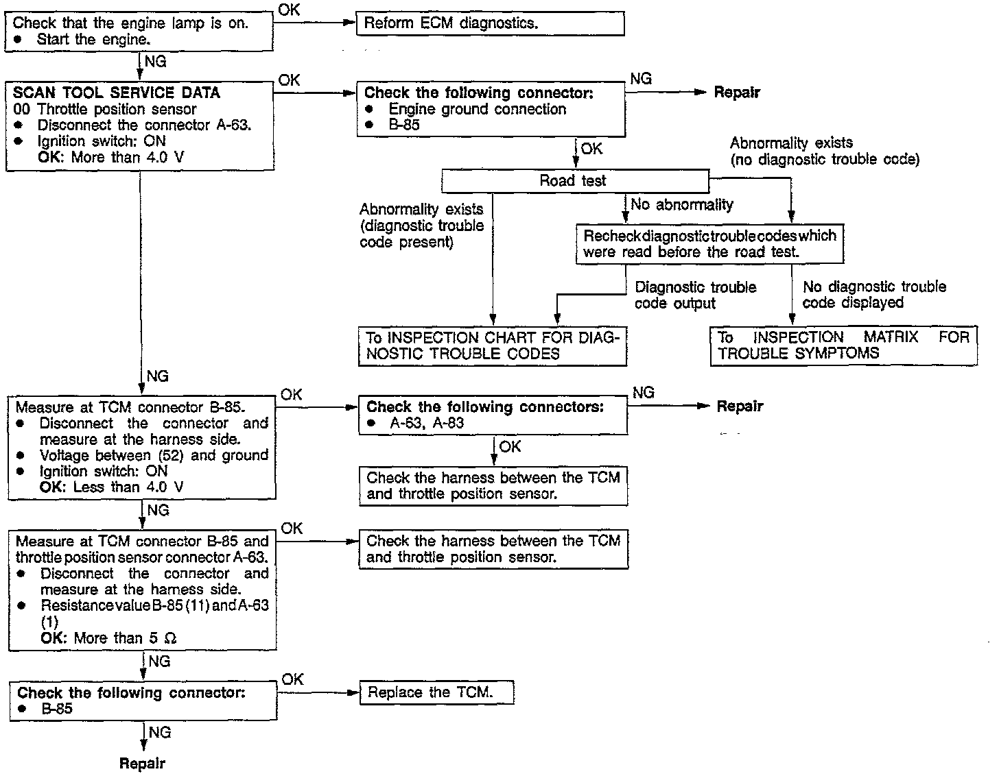 - Harness or connector between throttle position sensor and TCM open or short-circuited