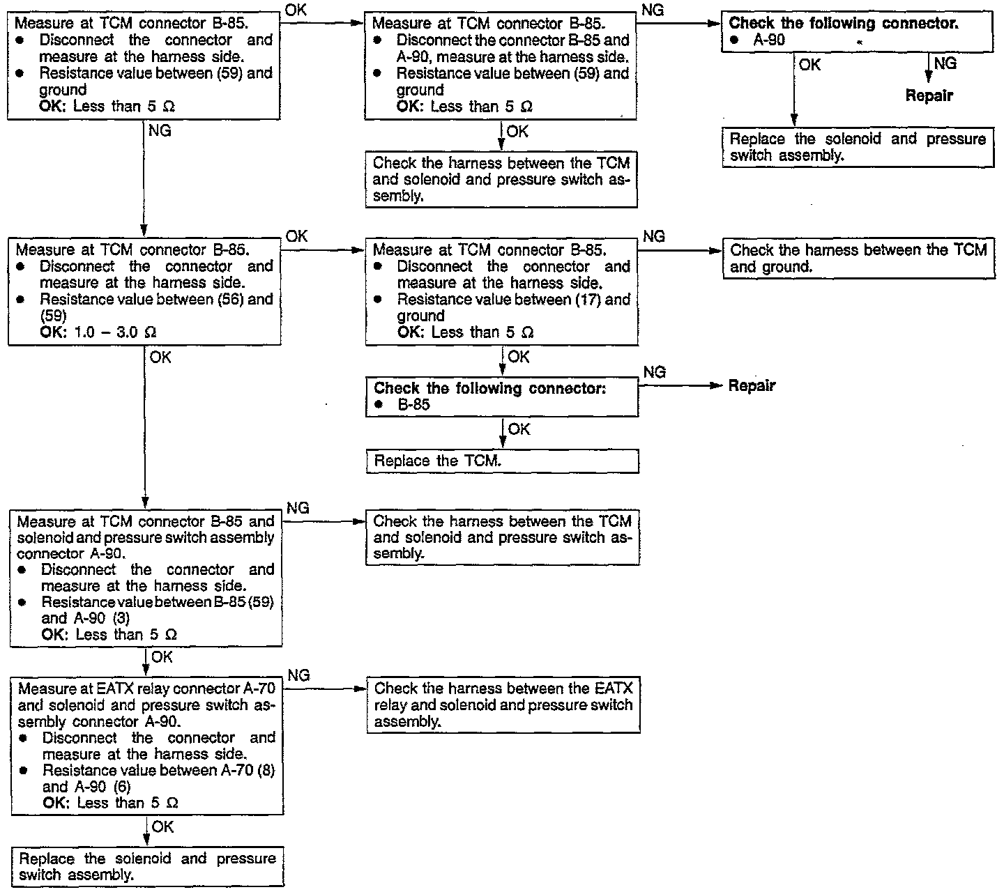 - Harness or connector between 2-4 solenoid and TCM open or short-circuited