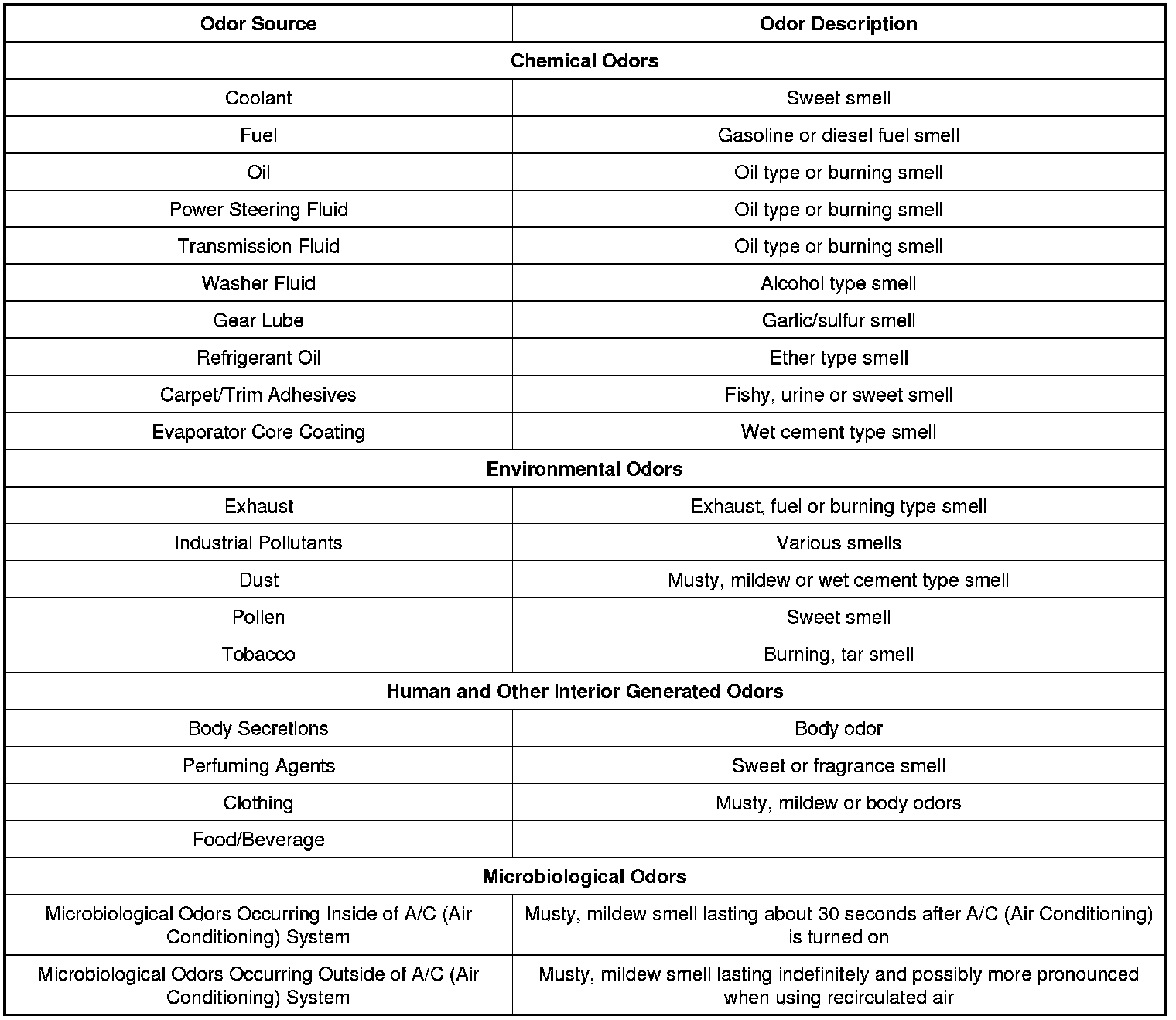 1. Identify the type of odor present in the vehicle. Do not proceed with A/C (Air Conditioning) odor treatment if the odor source is found to be outside of the A/C (Air Conditioning) system. Refer to the following chart for examples.