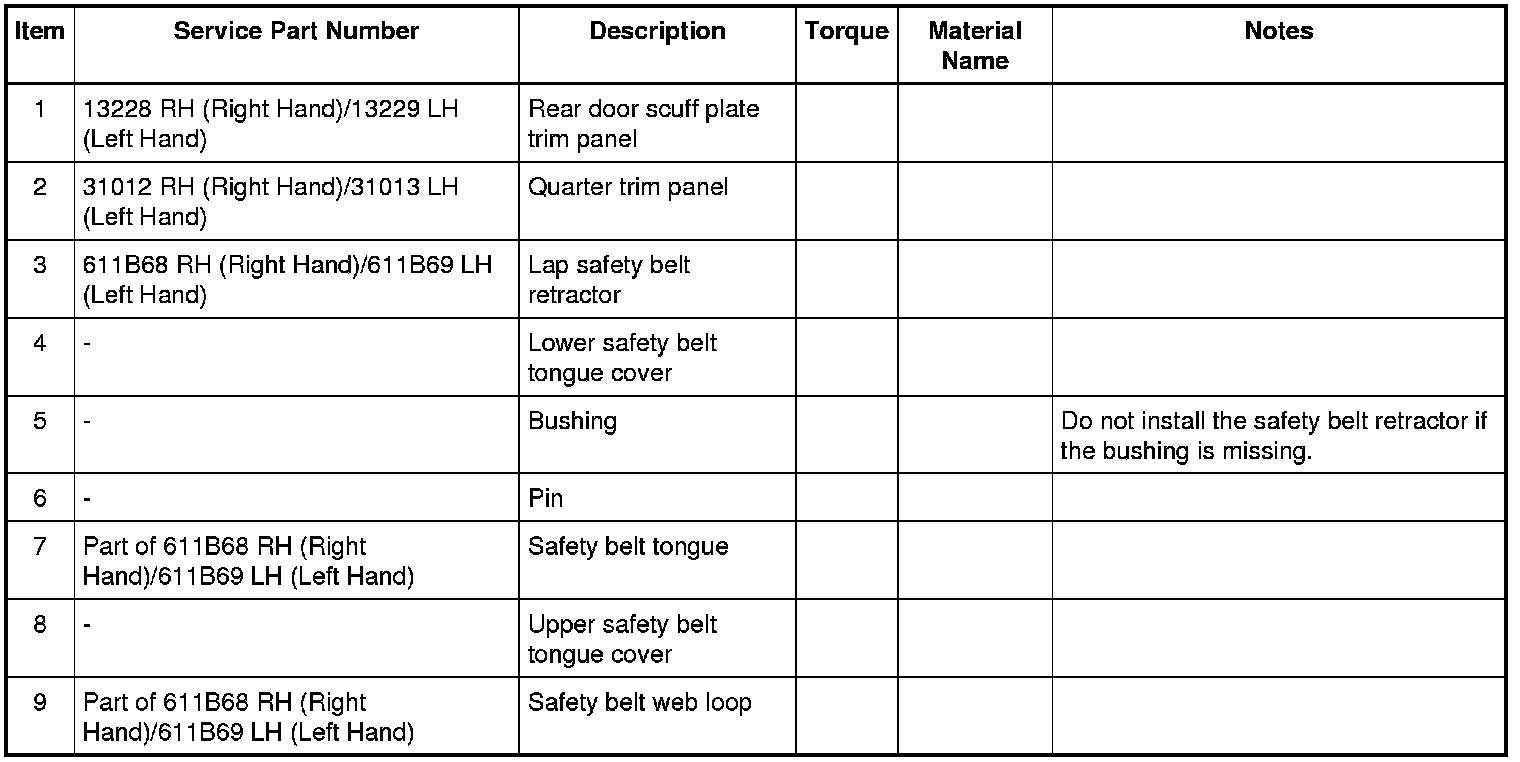WARNING: After a crash, all of the following second and third row safety belt components and attaching hardware must be inspected and tested to verify correct function: