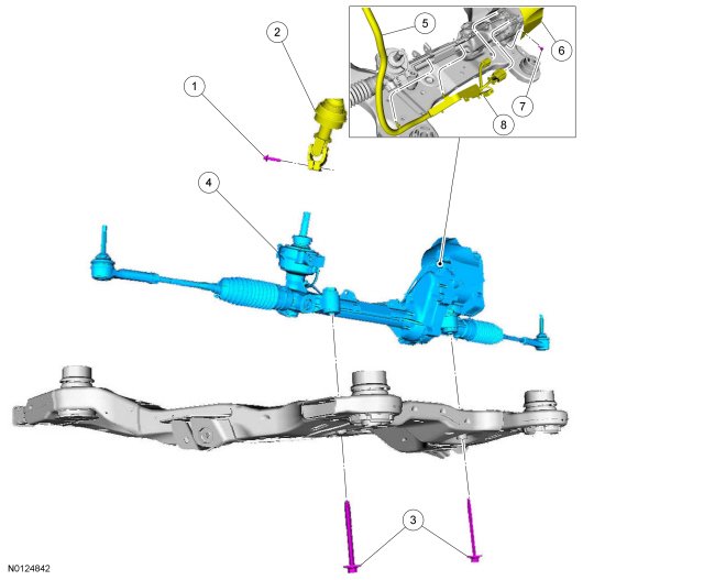 19. Remove and discard the 2 steering gear bolts and remove the steering gear from the RH (Right Hand) side of the vehicle.