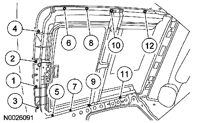 2. Tighten the 12 roof opening panel frame bolts in the sequence shown.