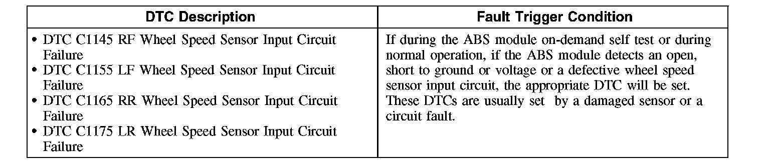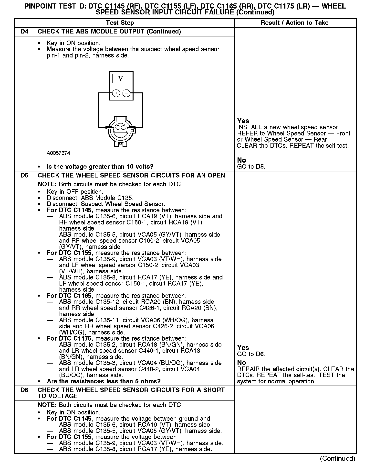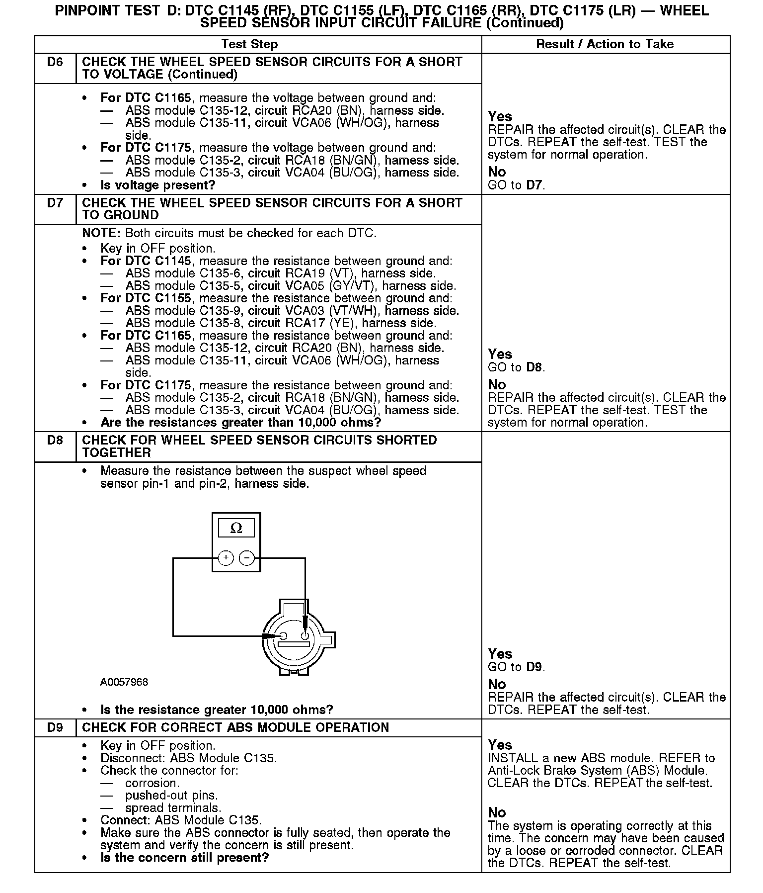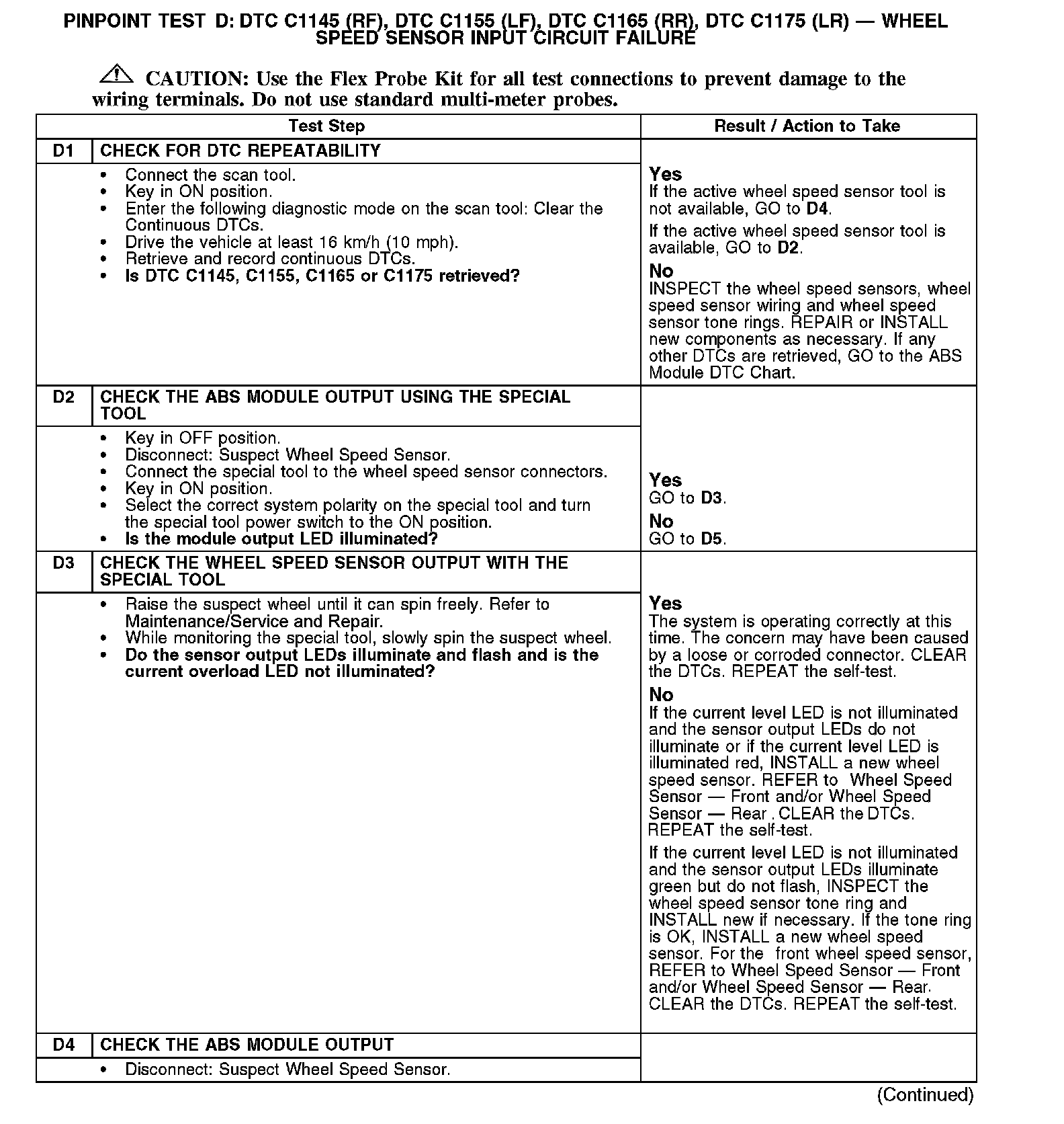 Test D: DTC C1145 (RF), DTC C1155 (LF), DTC C1165 (FIR), DTC C1175 (LR) - Wheel Speed Sensor Input Circuit Failure