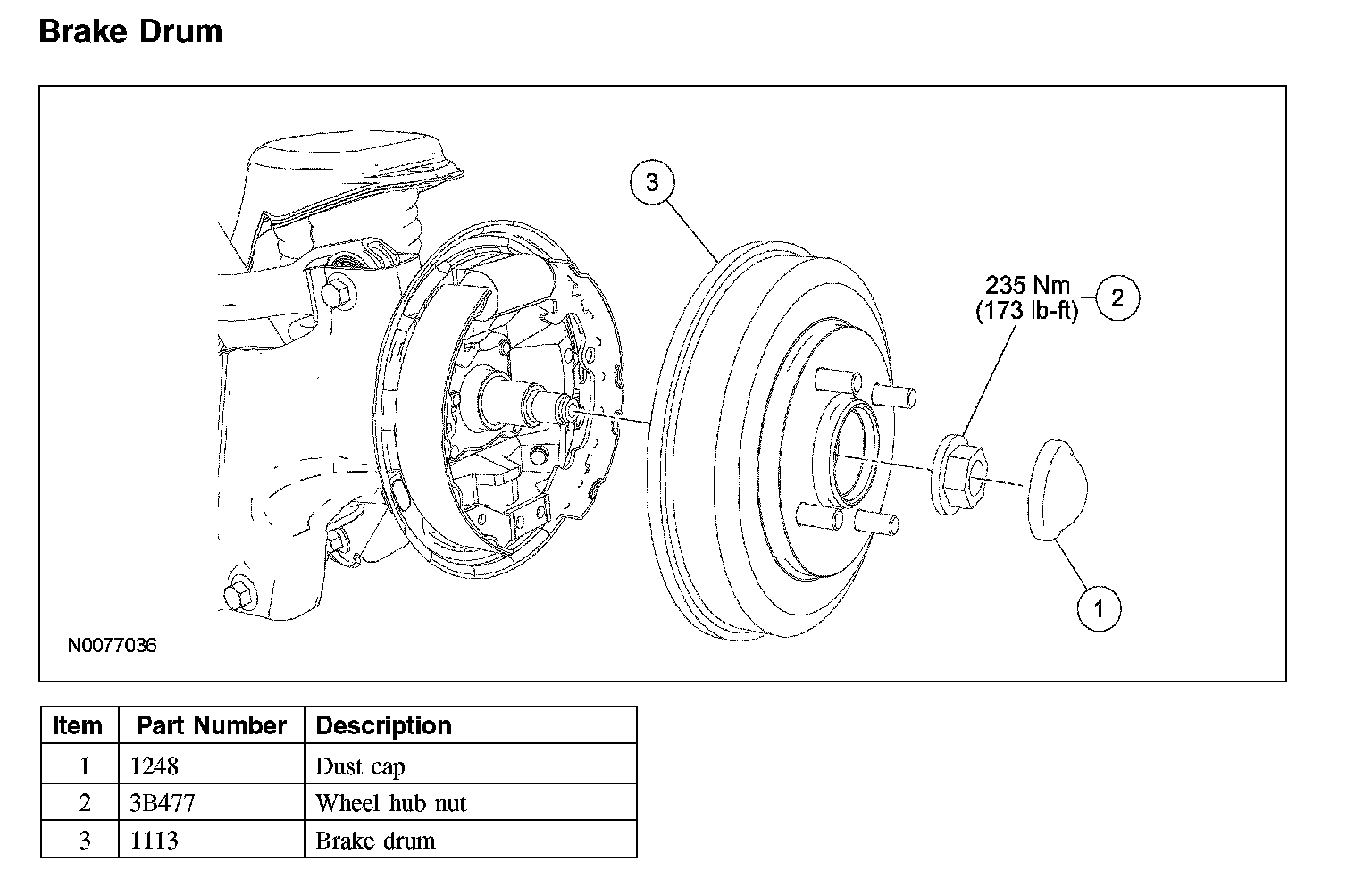 1. CAUTION: When tightening the new wheel hub nut, rotate the brake drum counterclockwise until the correct torque is achieved or damage to the wheel bearing may occur.