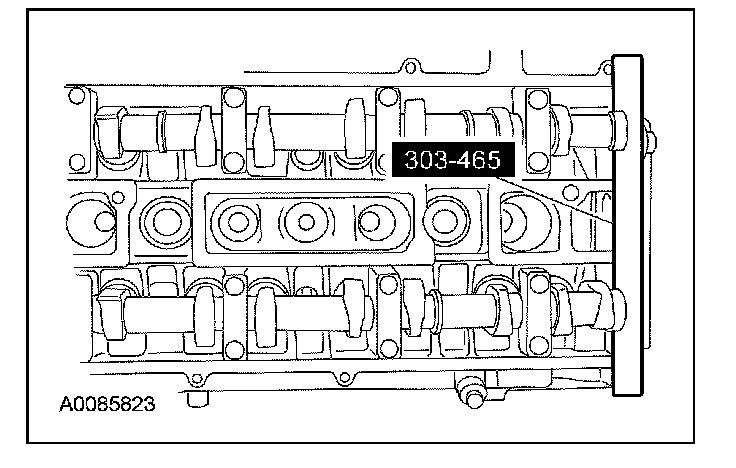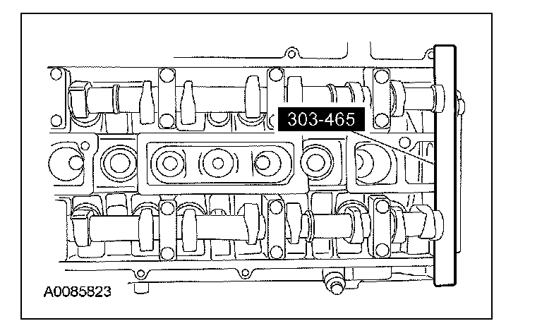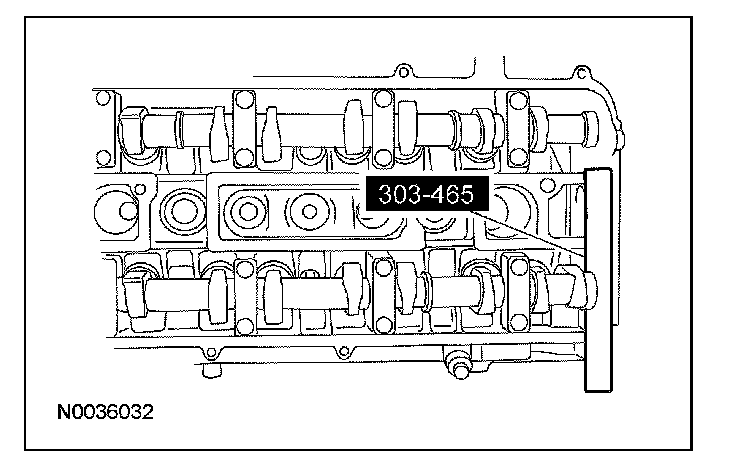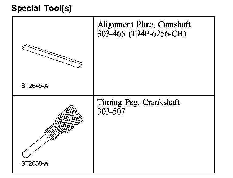 7. CAUTION: The special tool (303-465) is for camshaft alignment only. Using this tool to prevent engine rotation can result in engine damage.