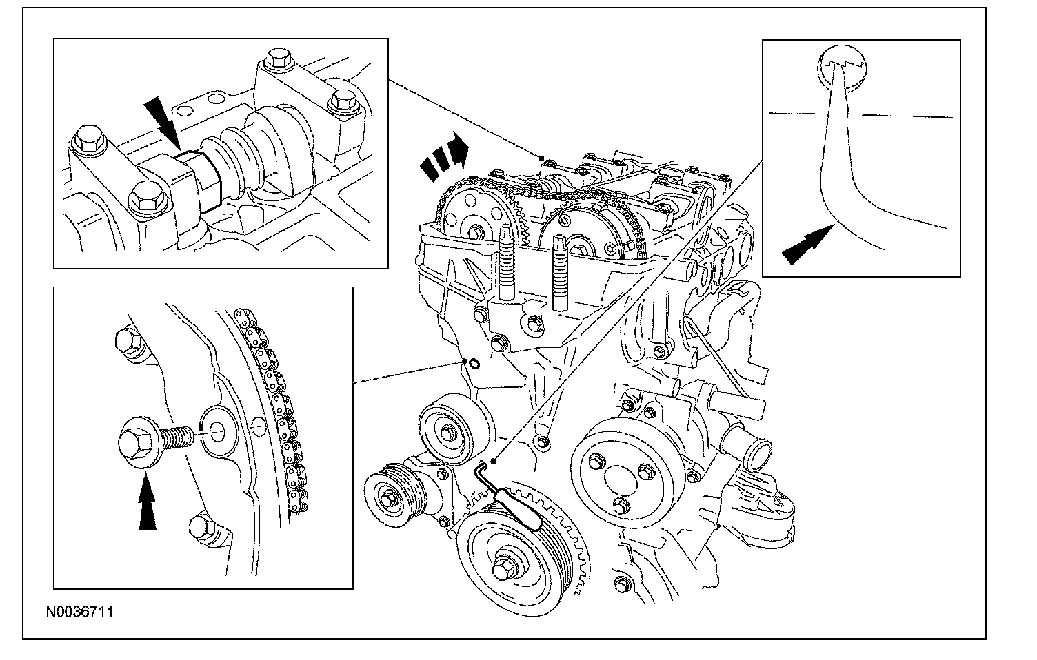 ^ Insert an M6 x 30 mm (1.18 in) bolt into the upper front cover timing hole to hold the tensioner arm in place.