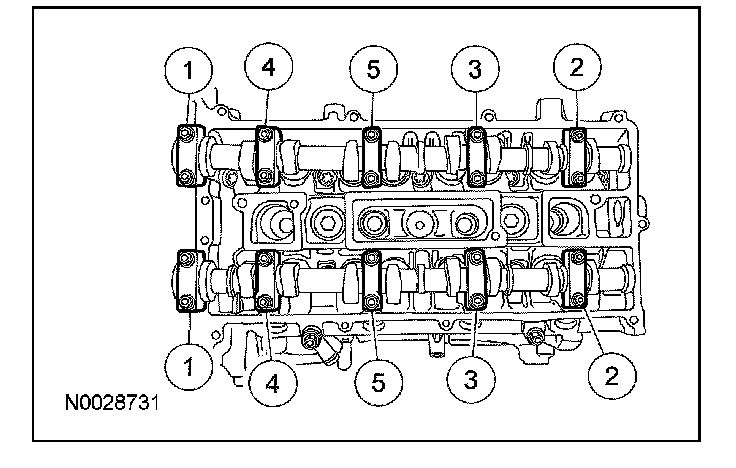 Install the camshafts and bearing caps in their original location and orientation. Tighten the bearing caps in the sequence shown in 3 stages: