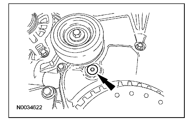 Remove the M6 x 30 mm bolt from the upper front cover timing hole to unlock the tensioner arm.