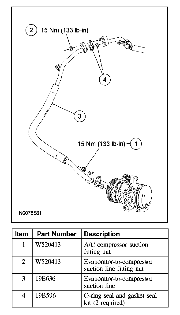 2. Remove the A/C compressor suction fitting nut and disconnect the fitting.