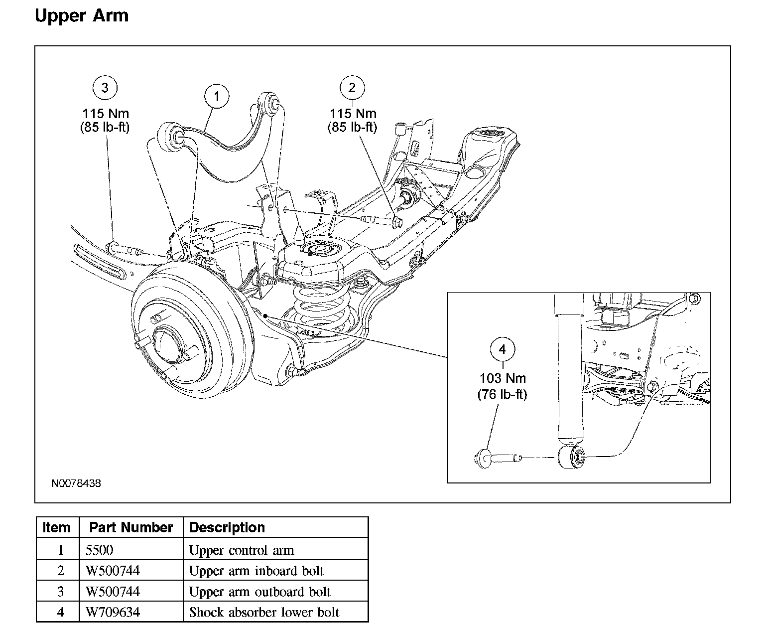 6. Tighten the upper arm inboard bolt to 115 Nm (85 ft. lbs.).