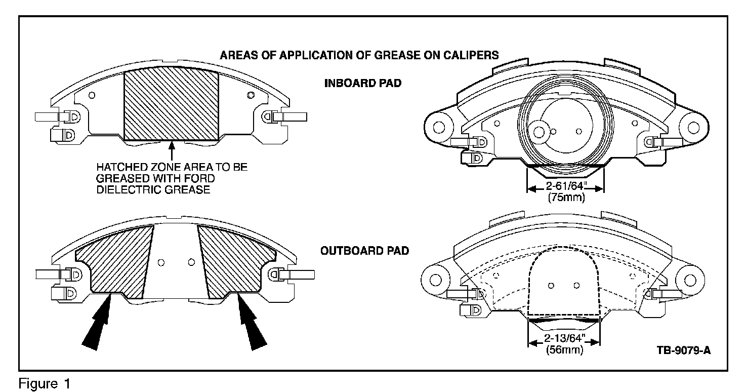 2. Apply a SMALL amount of Motorcraft� Silicone Brake Caliper Grease and Dielectric Compound to the indicated areas. (Figure 1)