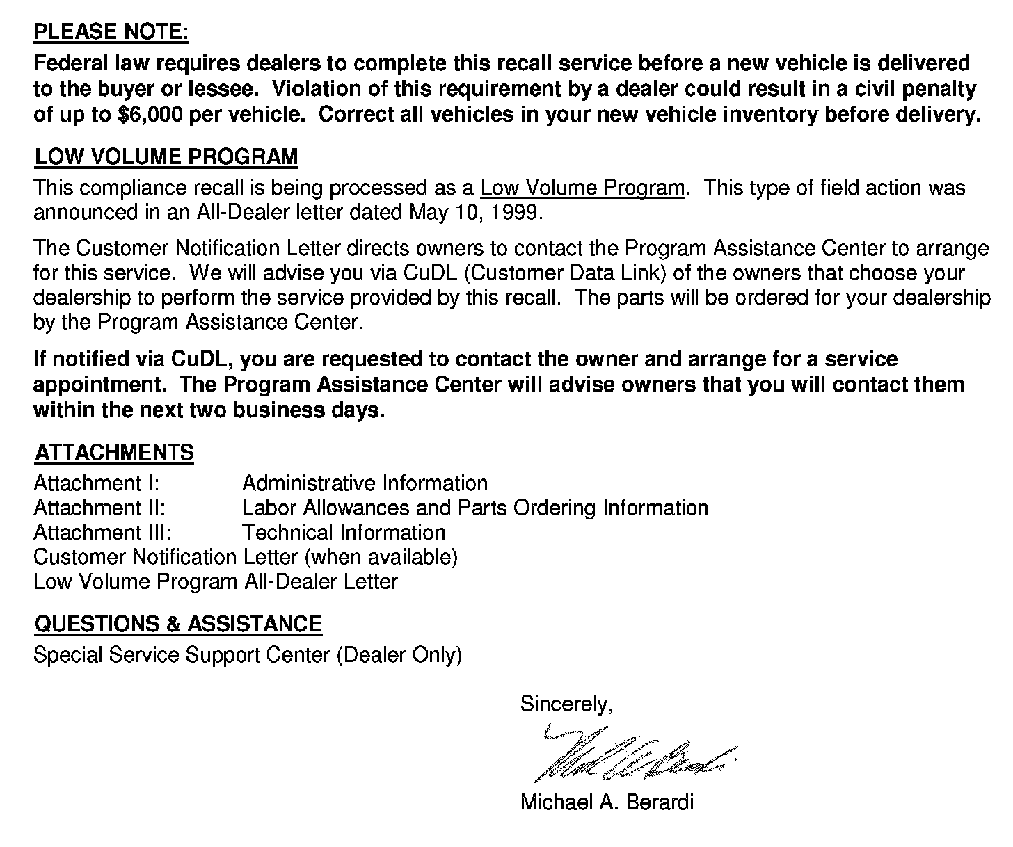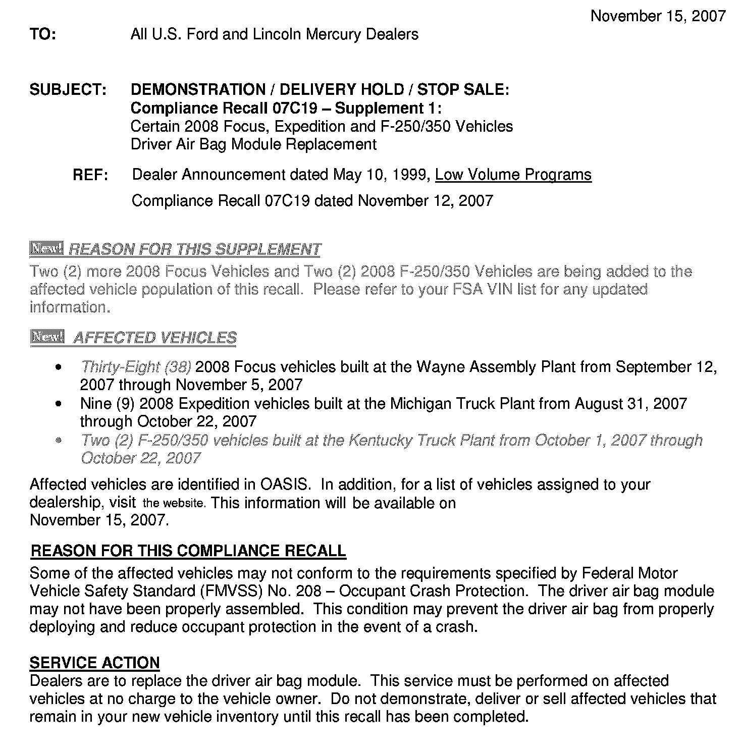 Recall - Air Bag Replacement (Delivery Hold/Stop Sale)