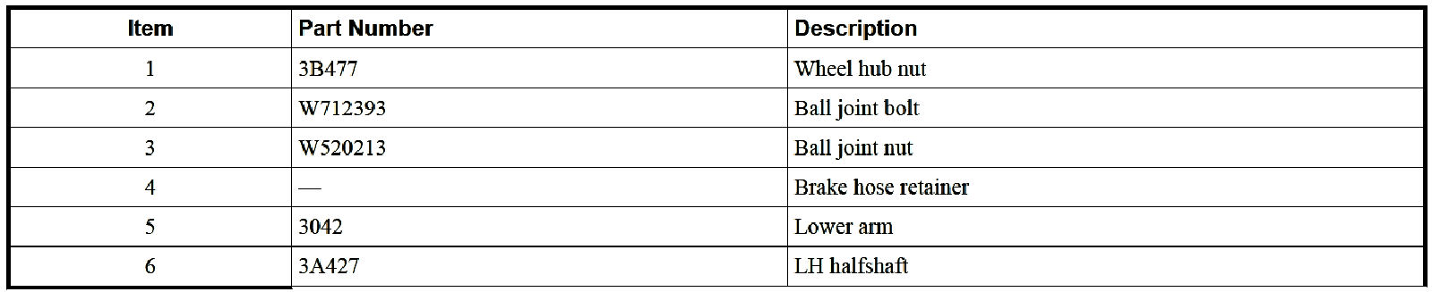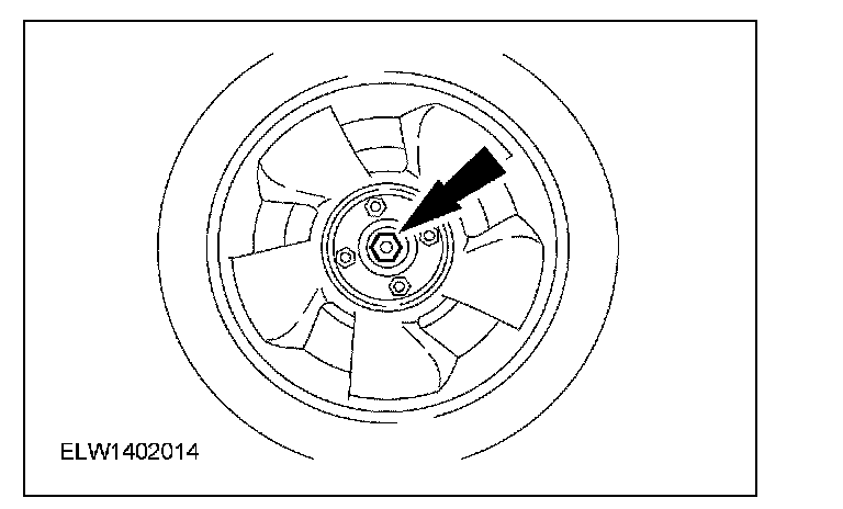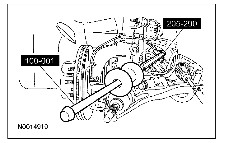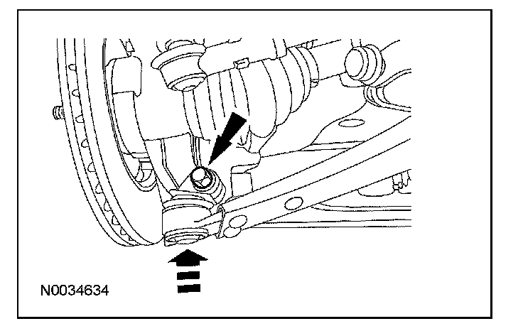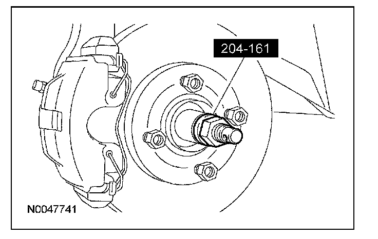 6. CAUTION: Do not tighten the front wheel hub nut with the vehicle on the ground. The nut must be tightened to specification before the vehicle is lowered onto the wheels. Wheel bearing damage will occur if the wheel bearing is loaded with the weight of the vehicle applied.
