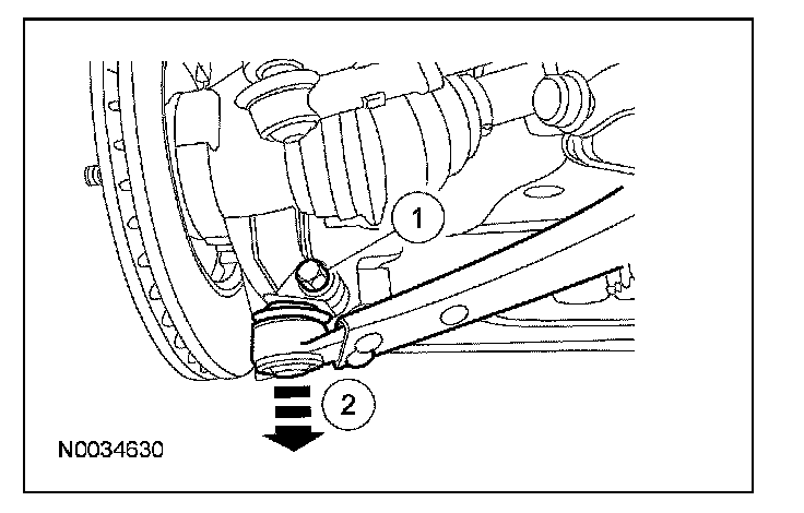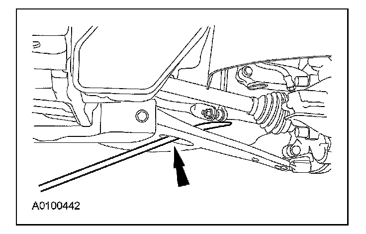 4. CAUTION: Do not use a prying device or separator fork between the lower arm ball joint and the knuckle. Damage to the ball joint or ball joint dust boot may result. Only use the pry bar by inserting it into the lower control arm body opening.