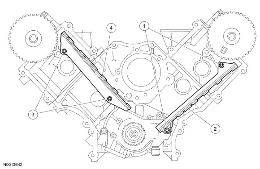 57. NOTICE: Unless otherwise instructed, at no time when the timing chains are removed and the cylinder heads are installed is the crankshaft or camshaft to be rotated. Severe piston and valve damage will occur.