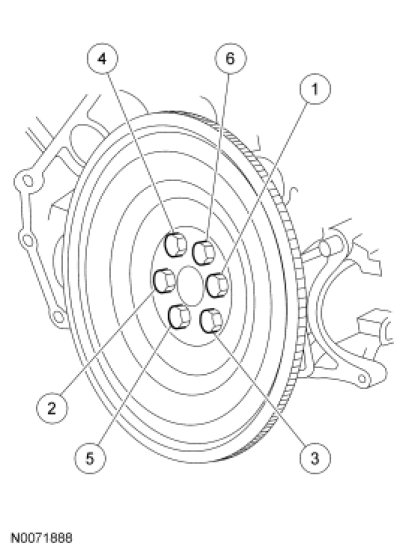 Position the flexplate and install the 6 bolts in the sequence shown.