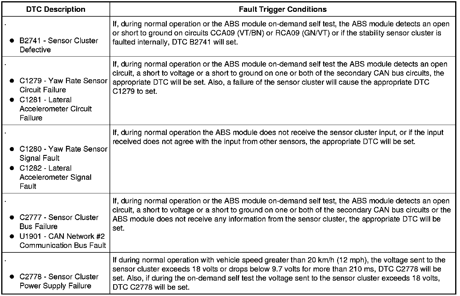 The yaw rate sensor, lateral accelerometer and longitudinal accelerometer are contained in one assembly called the stability control sensor cluster. The sensor cluster measures vehicle yaw rate, lateral and longitudinal acceleration and then sends the information to the ABS module along a secondary Controller Area Network (CAN) bus. This CAN bus is used only for communication between the sensor cluster and the ABS module. The information sent to the ABS module is used to help determine if the Electronic Stability Control (ESC) system needs to be activated.