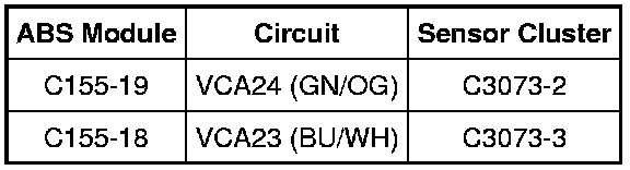 - Measure the resistance between ABS module C155-29, circuit RCA09 (GN/VT), harness side and sensor cluster C3073-1, circuit RCA09 (GN/VT), harness side.