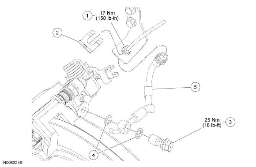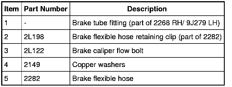 2. Remove the brake caliper flow bolt and discard the 2 copper washers.