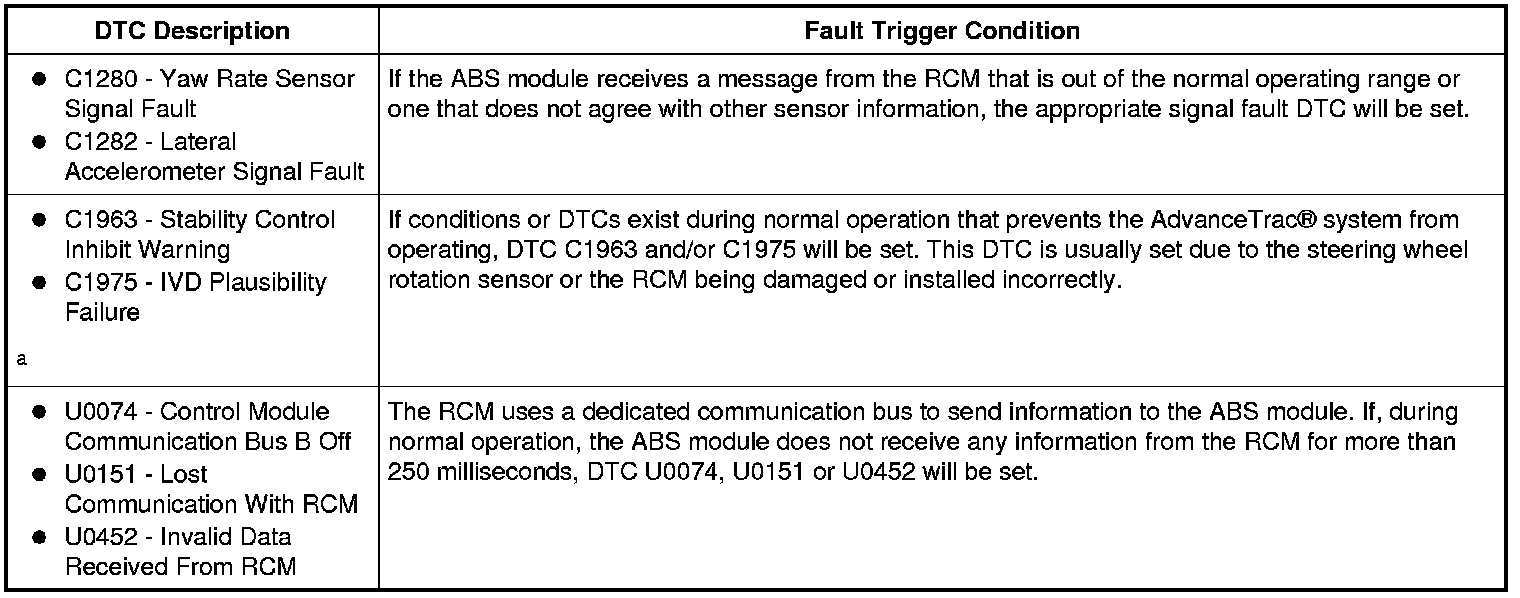 The Restraints Control Module (RCM) measures the yaw rate and vehicle acceleration, then sends the signal through a secondary, dedicated Controller Area Network (CAN) bus to the ABS module. The ABS module uses this information for AdvanceTrac(R) system operation. The ABS module also compares this information to the information it receives from other sensors (brake pedal input, steering wheel rotation sensor, etc.) to determine how valid the information is and to determine if an instability event is about to occur and if intervention is necessary.