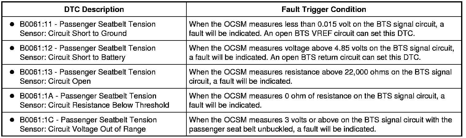 The Occupant Classification System Module (OCSM) monitors the BTS and all circuitry for the following faults: