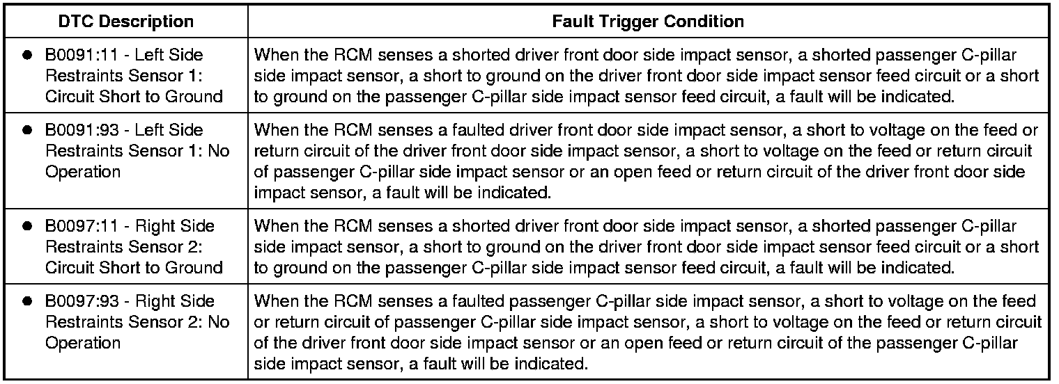The Restraints Control Module (RCM) monitors the driver front door and passenger C-pillar side impact sensors and circuits for the following faults: