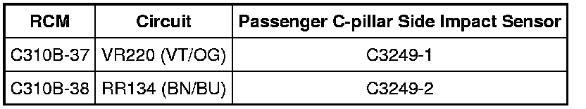 - Connect a fused jumper wire between passenger C-pillar side impact sensor C3249-1, circuit VR220 (VT/OG), harness side and C3249-2, circuit RR134 (BN/BU), harness side.