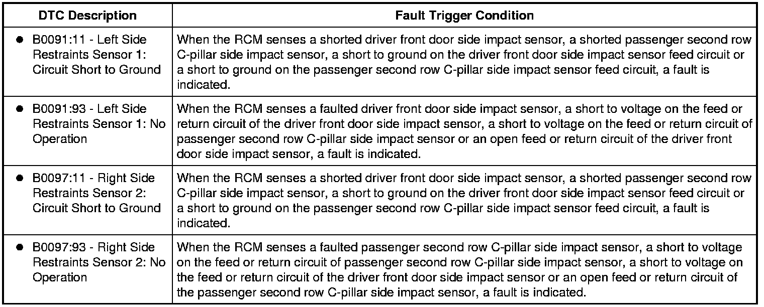 The Restraints Control Module (RCM) monitors the driver front door and passenger second row C-pillar side impact sensors and circuits for the following faults:
