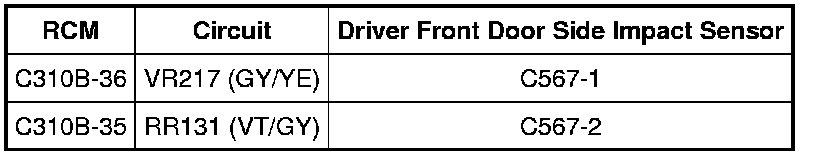 - Connect a fused jumper wire between driver front door side impact sensor C567-1, circuit VR217 (GY/YE), harness side and C567-2, circuit RR131 (VT/GY), harness side.