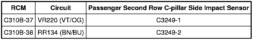 - Connect a fused jumper wire between passenger second row C-pillar side impact sensor C3249-1, circuit VR220 (VT/OG), harness side and C3249-2, circuit RR134 (BN/BU), harness side.