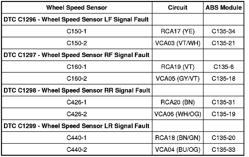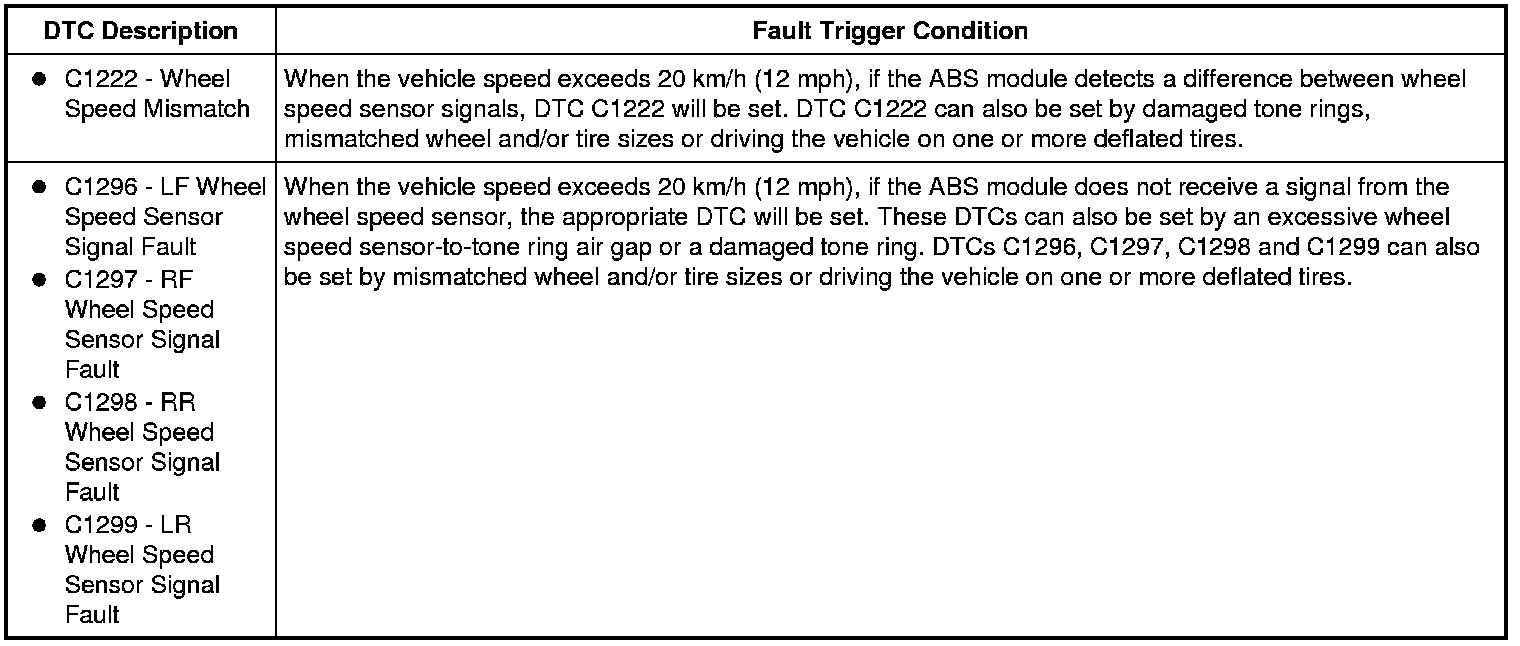 The wheel speed sensor and sensor ring generates a square wave current signal to the ABS module that is proportional to the wheel speed. The ABS module compares the wheel speed inputs from all the wheel speed sensors to determine an impending wheel lockup. Incorrect/mismatched tire size can set these DTCs as well.