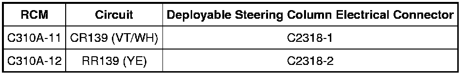 - Measure the resistance between deployable steering column C2318-1, circuit CR139 (VT/WH), harness side and C2318-2, circuit RR139 (YE), harness side.