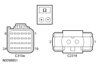 - Measure the resistance between RCM C310A, harness side and deployable steering column C2318, harness side using the following chart.