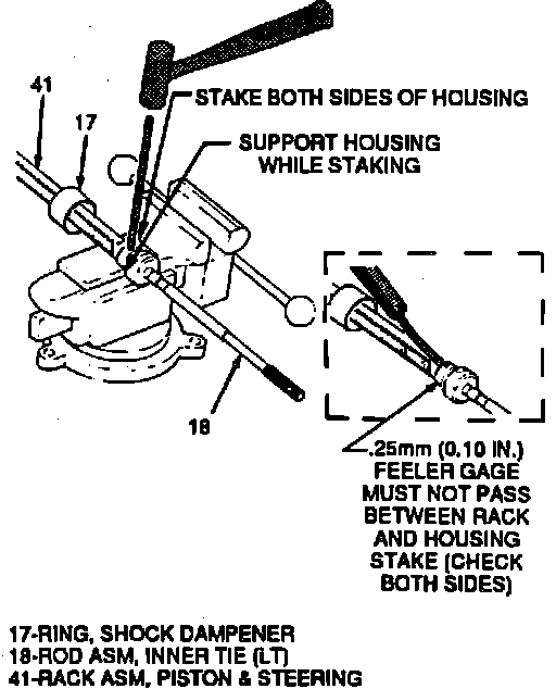 3. Check both stakes by inserting a .010 inch feeler gauge between rack and housing stake.