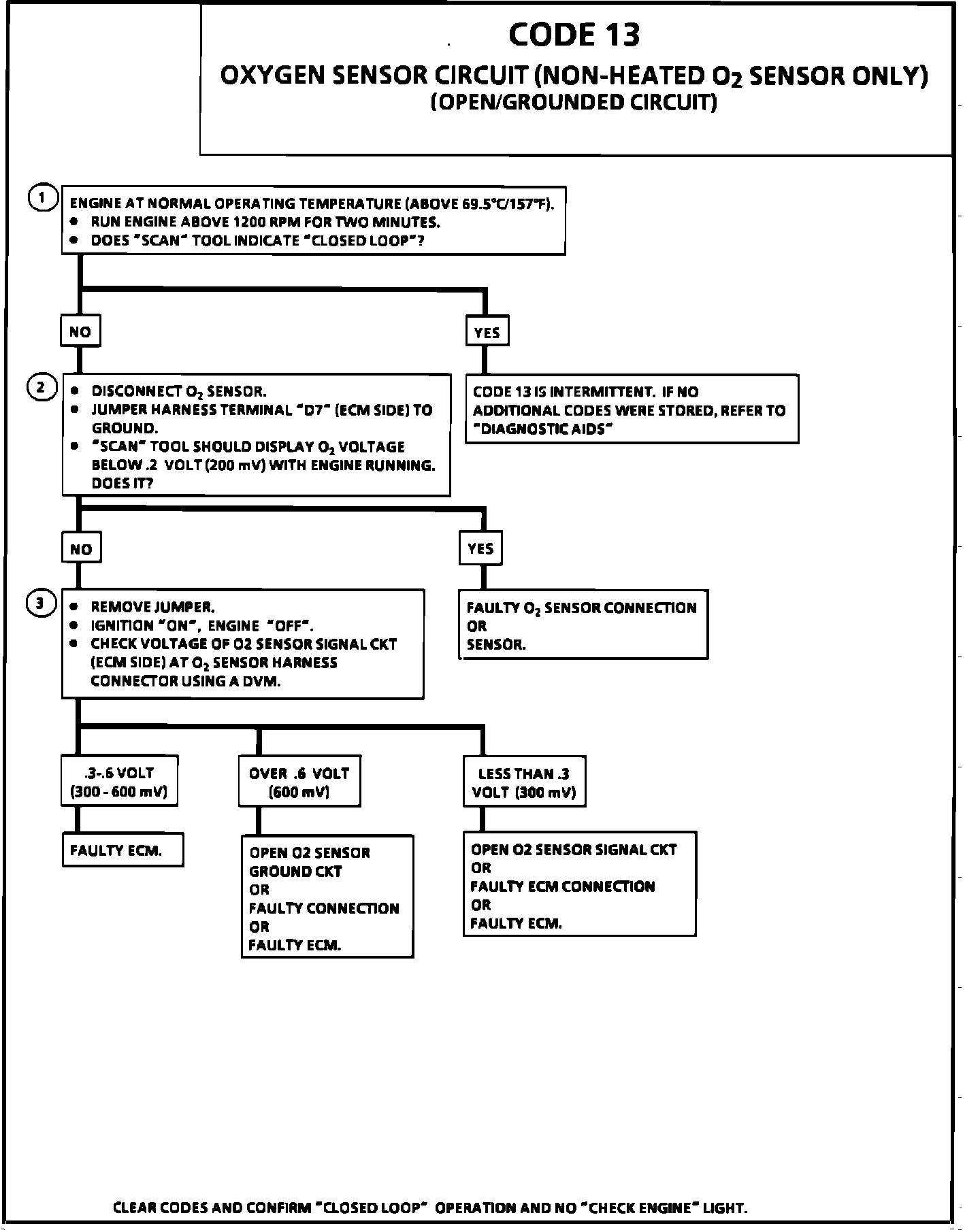 Normal voltage on circuit 412 varies between 100 mV and 999 mV (0.1 and 1.0 volt), while in "CLOSED LOOP." Code 13 sets within one minute, if voltage remains between 0 and 0.347 volt, but the system will go "OPEN LOOP" in about 15 seconds. Verify a clean, tight ground connection for circuit D6. Open circuit(s), D7 or D6 will result in a Code 13. If Code 13 is intermittent, Testing and Inspection