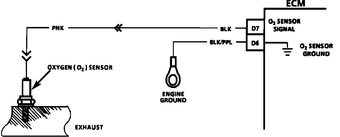 The ECM supplies a voltage of about of 0.45 volt between terminal D7 and D6. (If measured with a 10 megohm digital voltmeter, this may read as low as 0.32 volts). The oxygen sensor varies the voltage within a range of about 1 volt, if the exhaust is rich, down through about 0.10 volt, if exhaust is lean. The sensor is like an open circuit and produces no voltage, when it is below 360°C (600°F). An open sensor circuit, or cold sensor, causes "OPEN LOOP" operation.